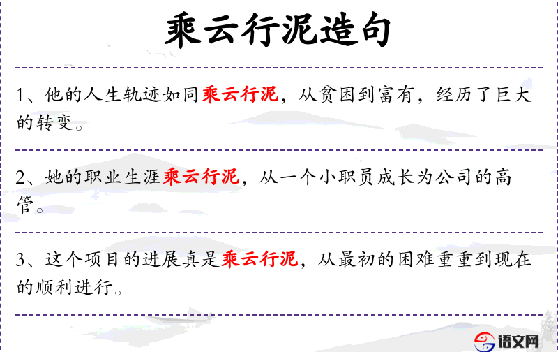 - 乘云行泥:比喻从低到高,从困难到顺利的成长过程。