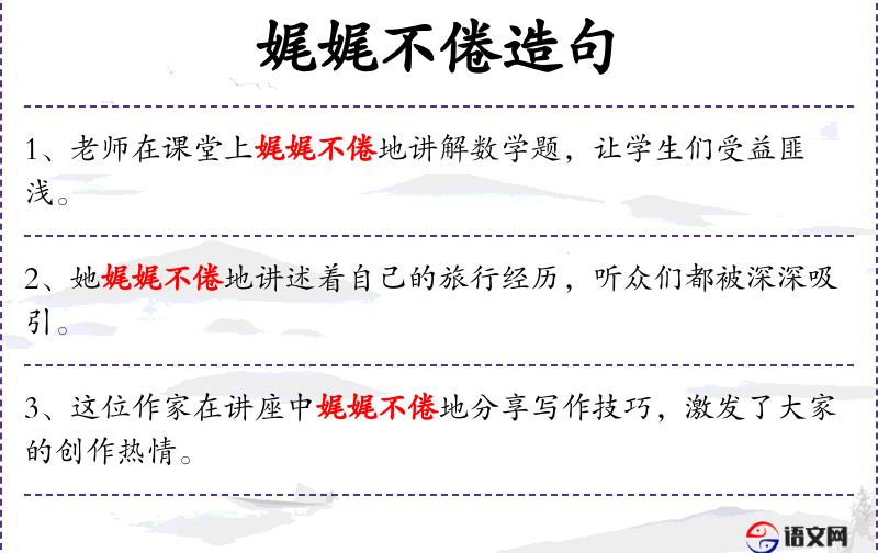 - 相关成语:“诲人不倦”(教导别人不知疲倦)与“娓娓不倦”有相似的含义,都强调了教育者的耐心和奉献。