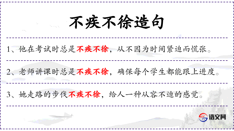 - 不疾不徐:成语,形容做事不急不慢,恰到好处。