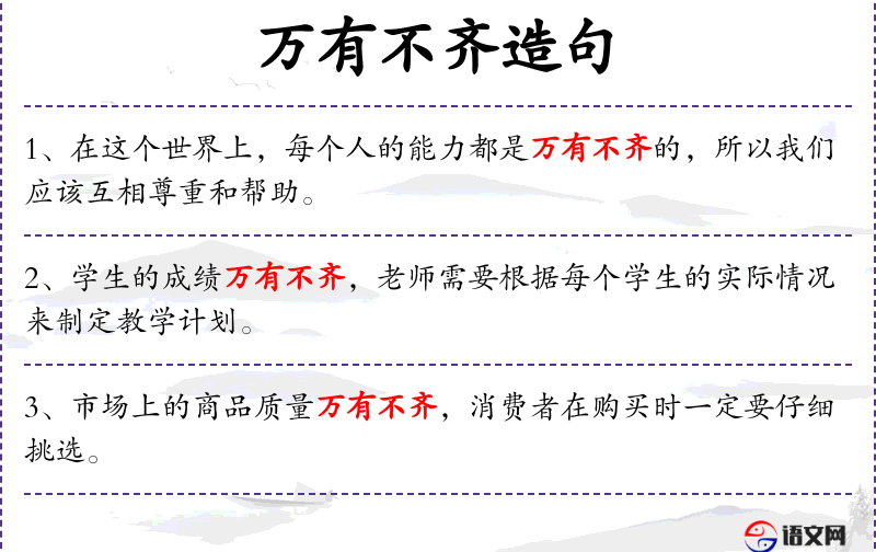 - 万有不齐:形容事物质量参差不齐,有好有坏。