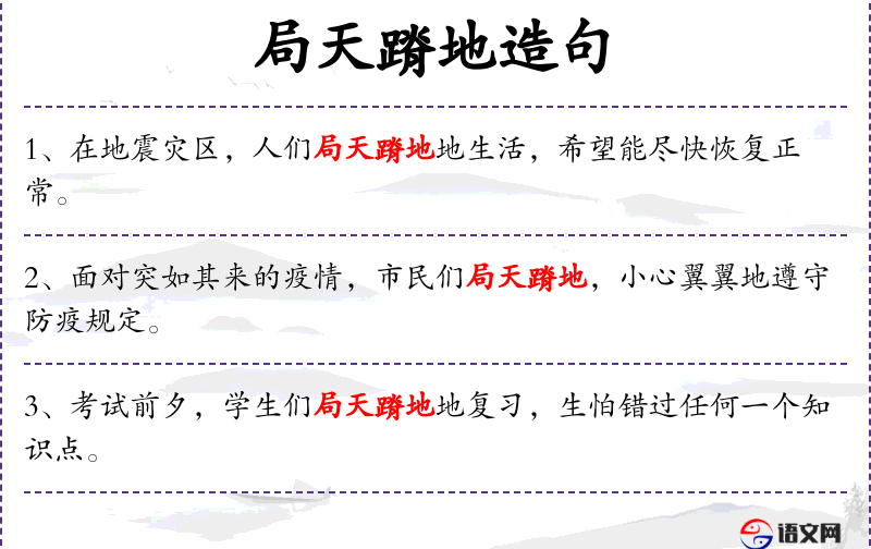 句子:“在地震灾区,人们局天蹐地地生活,希望能尽快恢复正常。”