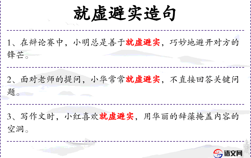 成语“就虚避实”:这个成语源自*古代的兵法,意指在战斗中回避敌人的主力,攻击其弱环节。在现代汉语中,这个成语常用来形容回避实质问题,只谈表面。