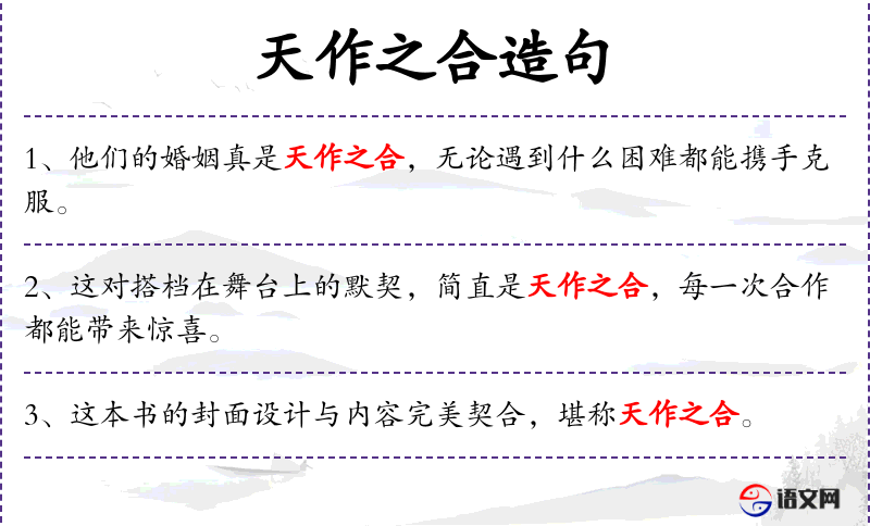 3. 【天作之合】 合:配合。好象是上天给予安排,很完美地配合到一起。祝人婚姻美满的话。