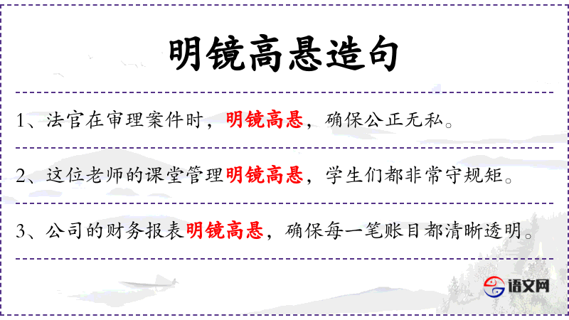 - 明镜高悬:这个成语源自**古代,原意是指官府衙门上的匾额,象征公正无私。在这里比喻审计工作的公正和透明。