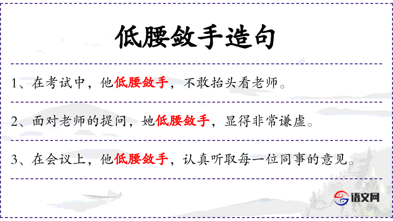 句子:“她在新老师面前低腰敛手,表现出极大的尊重。”