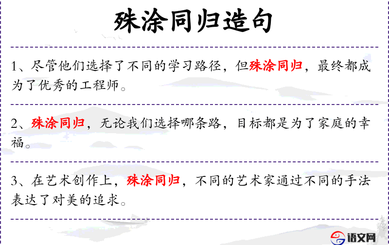 1. 【殊涂同归】 - 本指由不同途径达到同一目的地。后比喻采用不同方法得到相同结果。