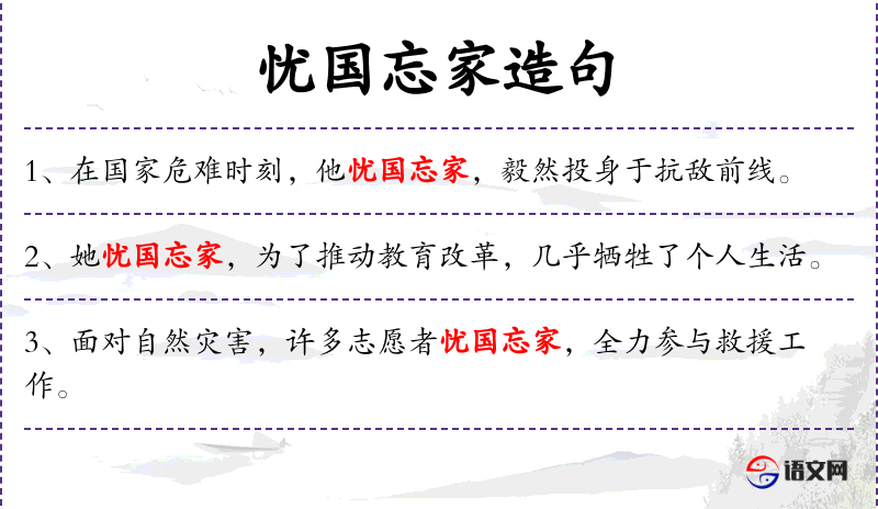 - 忧国忘家:形容非常关心国家大事而忽略家庭。