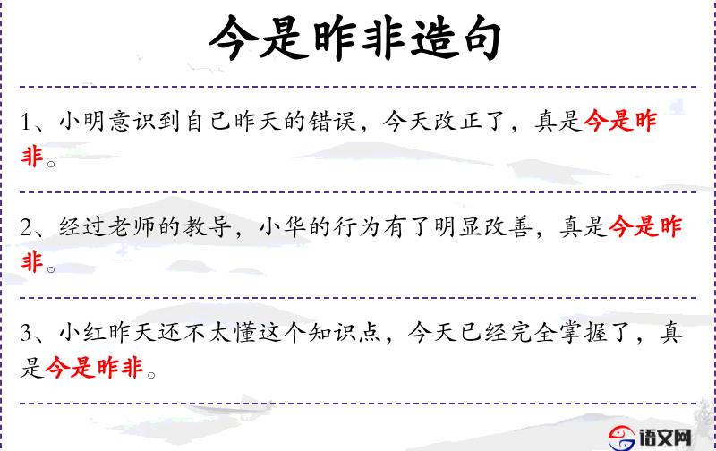 - 今是昨非:成语,表示今天和昨天的情况完全不同。