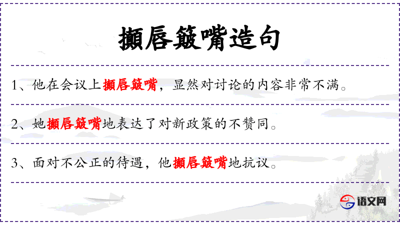 “控唇簸嘴”是一个具有**文化特色的成语,用来形容说话时嘴唇的动作,通常表示不认同或不满。了解这个成语的文化背景有助于更好地理解句子中的情感色彩。