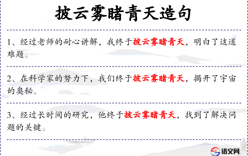 - 披云雾睹青天:这个成语源自**古代文学,比喻经过困难或迷惑后终于看清真相或目标。