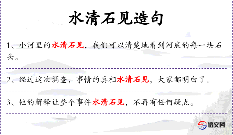 4. 【水清石见】 清:清澈;见:同“现”,显露。比喻情况搞清楚了,问题的性质也就明白了。