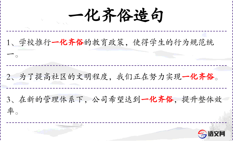 1. 【一化齐俗】 统一教化,整齐风俗。