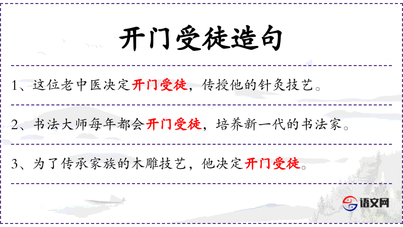 句子:“这位武术大师决定开门受徒,传授他的武术秘籍。”