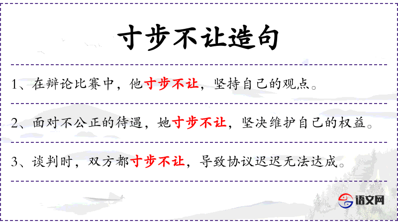 5. 【寸步不让】 连寸步也不让给别人。形容丝毫不肯让步、妥协。