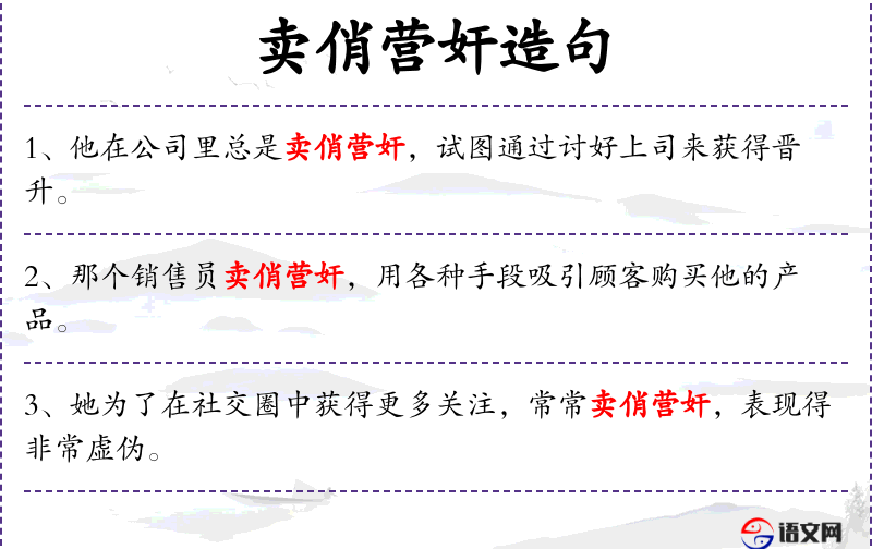 - 卖俏营奸:指使用不正当手段吸引注意或获得利益