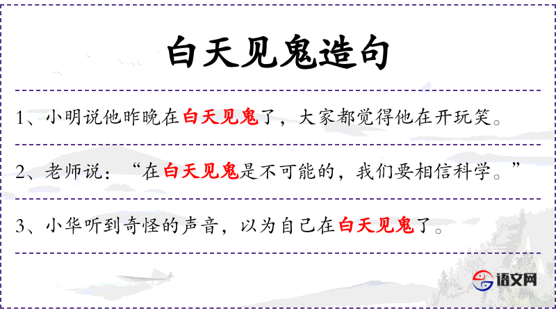 1. 【白天见鬼】 - 比喻虚妄荒诞,不可能出现的事。同“白日见鬼”。