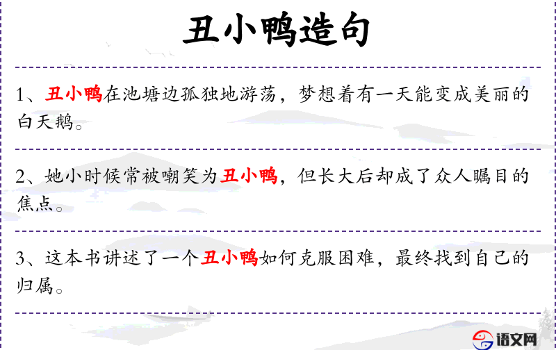 丹麦童话《丑小鸭》中的主人公,借指不被关注的小孩子或年轻人,有时也指刚刚出现、不为人注意的事物:从前的那个~如今变成了大明星。