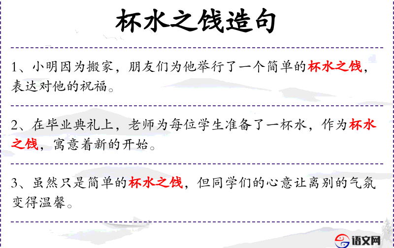 5. 【杯水之饯】 饯:送别。用一杯水为人送行。旧指官吏洁身自好,廉洁奉公。