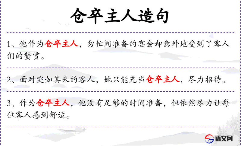 1. 【仓卒主人】 仓卒:匆忙。客人突然到来,仓促中招待不周,难尽主人之礼。