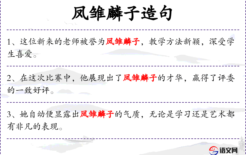 - 凤雏麟子:比喻非常杰出的人才,源自**古代神话中的神兽凤和麟。