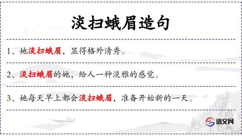 1. 【淡扫蛾眉】 - 轻淡地画眉。指妇女淡雅的化妆。