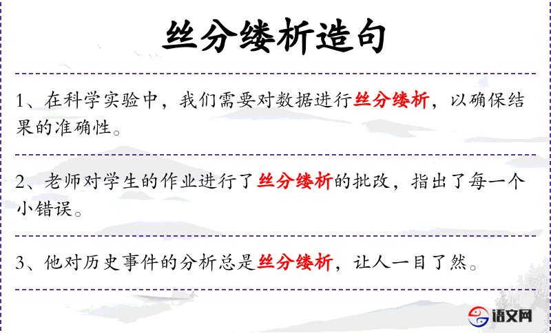 - 丝分缕析:源自**古代,形容分析问题非常细致。