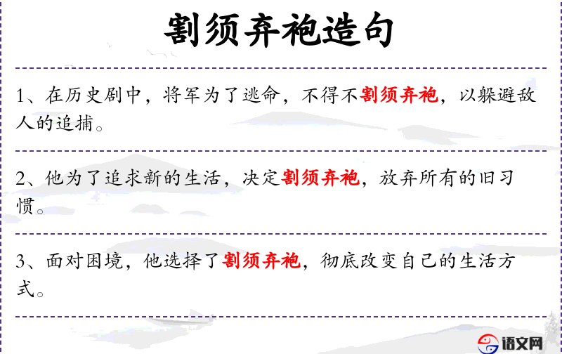 - 割须弃袍:在**传统文化中,割须弃袍常用来形容一个人为了逃避某种困境而采取的极端措施。