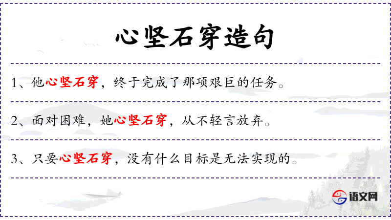 - 原句:他心坚石穿,终于完成了那项艰巨的任务。
