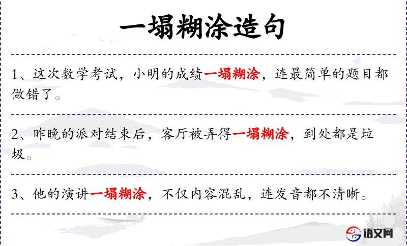 1. 【一塌糊涂】 - 糊涂:混乱。形容混乱或败坏到了不可收拾的程度。