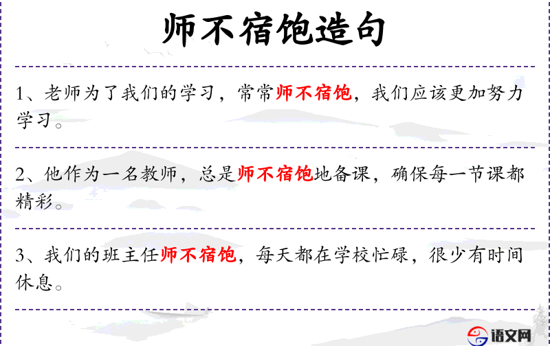 - 师不宿饱:成语,形容教师备课非常勤奋,不辞辛劳。