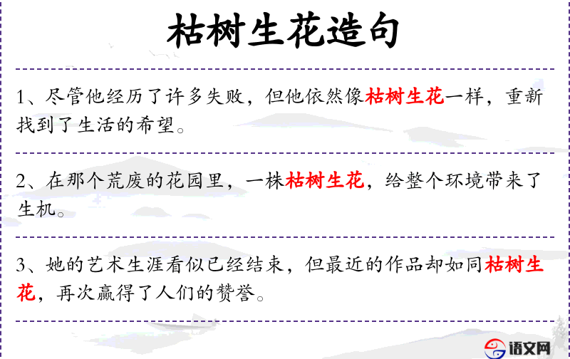 1. 【枯树生花】 枯树开起花来。比喻在绝境中又找到了生路。