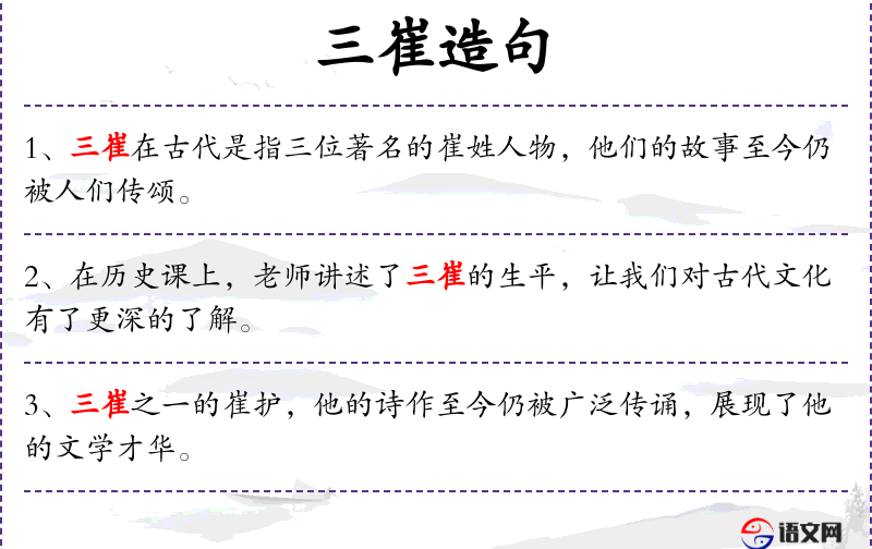 1. 【三崔】 - 汉崔髎及子瑗﹑孙寔,皆有文名,合称"三崔"。