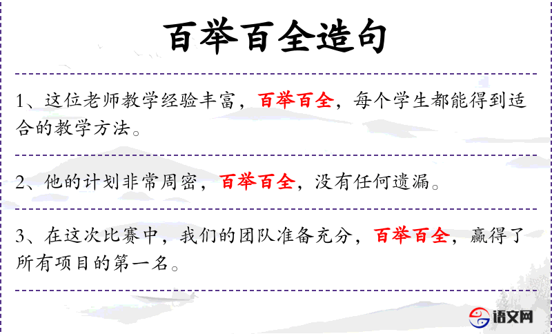 4. 【百举百全】 - 百:形容多;举:行动;全:完成。每次行动都能完成其事,形容事事得心应手,都能取得好的效果。