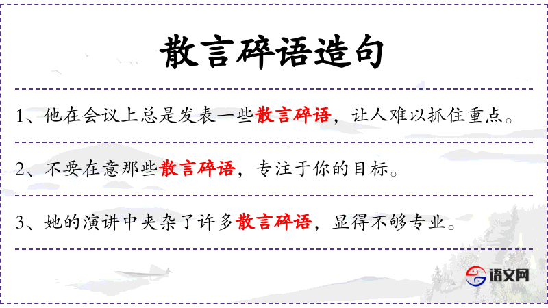 句子:“他在会议上总是发表一些散言碎语,让人难以抓住重点。”