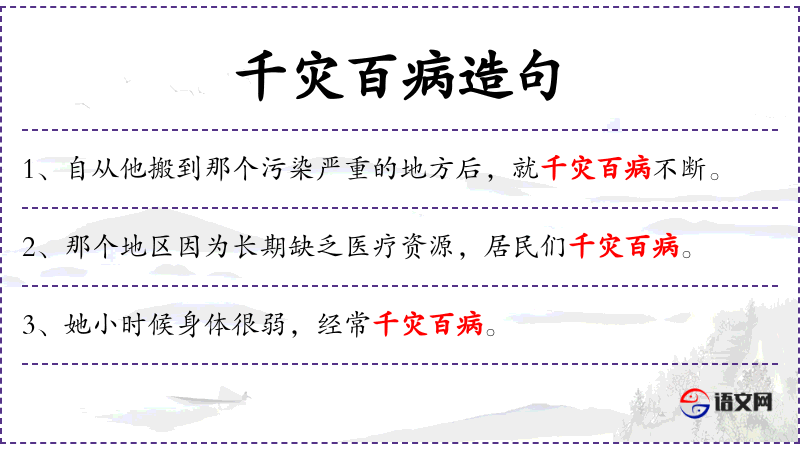 千灾百病:这个成语在**文化中常用来形容一个人经常生病,疾病多且频繁。它反映了人们对健康问题的关注和对疾病的恐惧。