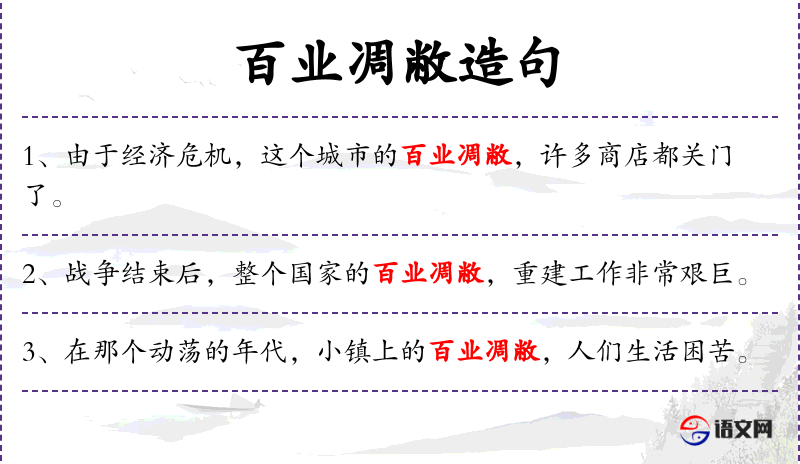 4. 【百业凋敝】 百业:一切行业。指各行各业都很萧条,不兴旺。形容社会的衰败。