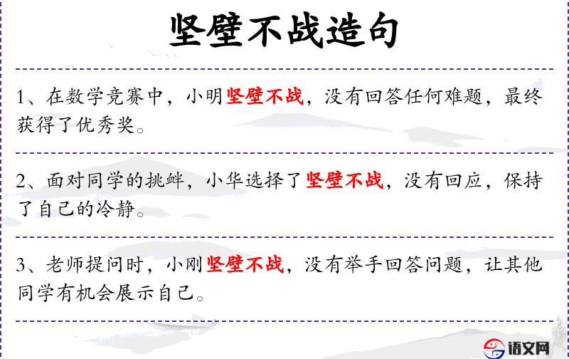 - 坚壁不战:remain defensive without engaging *. 回应:respond, reply