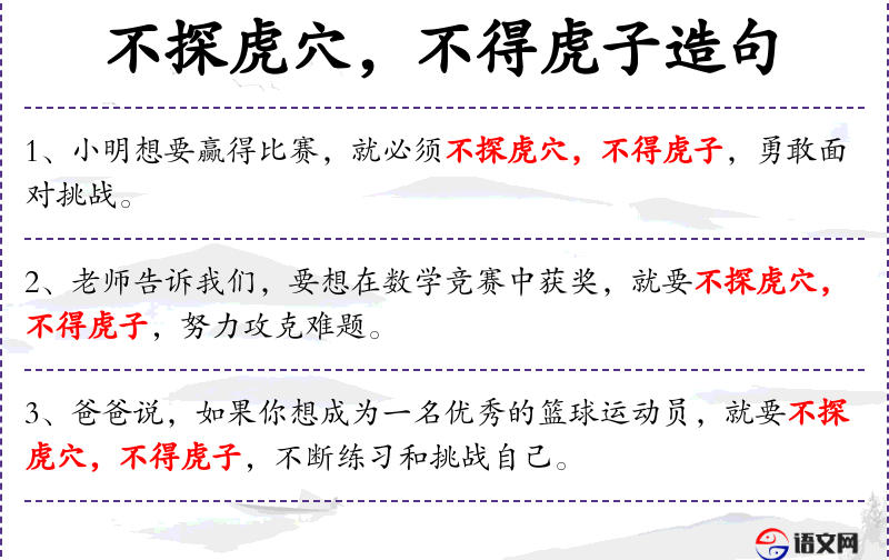 2. 【探虎穴】 - 比喻冒险。语本《后汉书.班超传》"不入虎穴,不得虎子。"