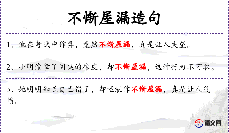 - 不惭屋漏:这个成语源自《左传·宣公十五年》,原意是指屋子漏了也不感到羞耻,比喻人不知羞耻。