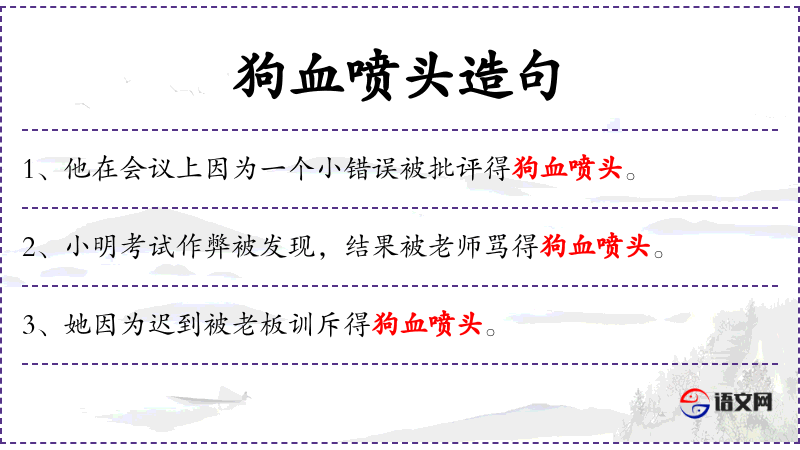 2. 【狗血喷头】 - 把狗血喷在头上。形容言辞刻毒,大肆辱骂。也形容骂得痛快淋漓。