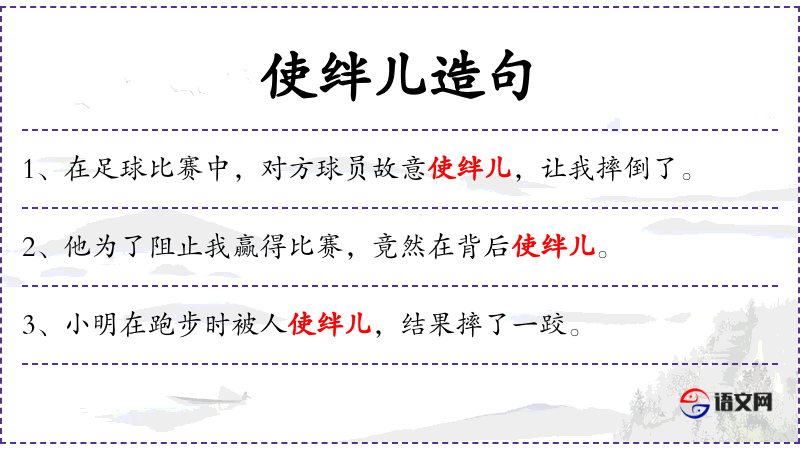 1. 【使绊儿】 摔交时用腿脚勾住对方的腿脚使跌倒。比喻用不正当手段暗害别人。