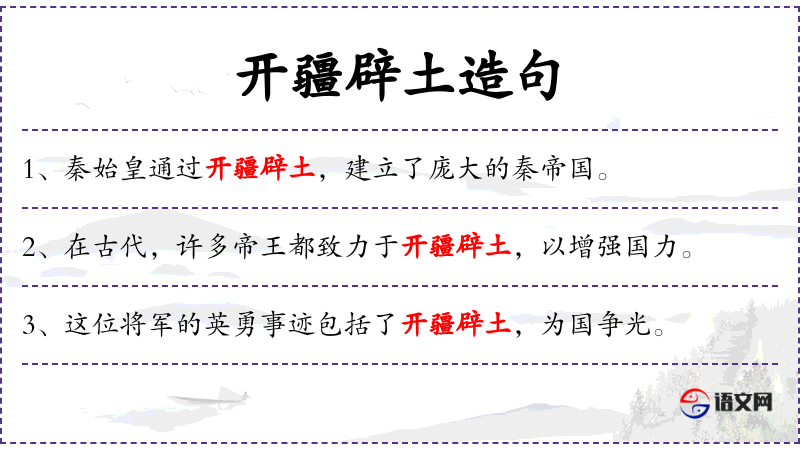 3. 【开疆辟土】 开:开拓;疆:边疆;辟:开辟;土:国土。开拓疆域,扩展领土。
