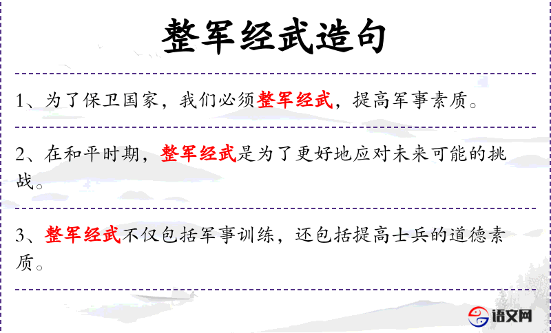1. 【整军经武】 经:治理。整顿军队,经营武备。