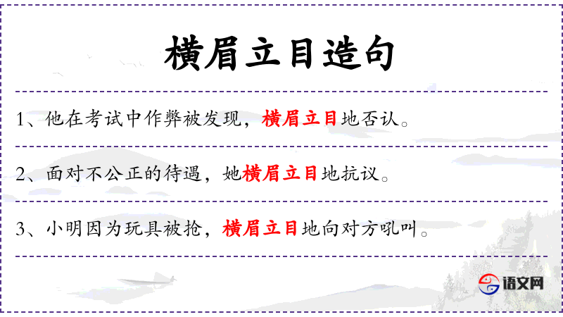 3. 【横眉立目】 - 犹言横眉努目。形容怒目相视,态度凶狠的样子。