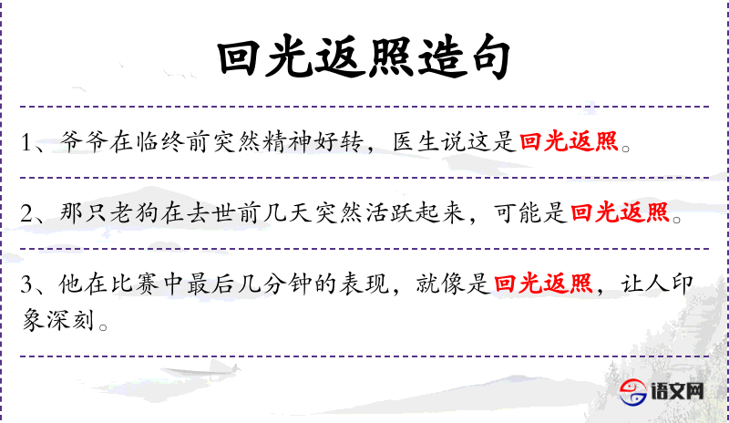 - 回光返照:这个成语源自古代对自然现象的观察,后来被用来形容人临终前的精神好转。在文化中,这种现象被认为是生命即将结束的征兆。