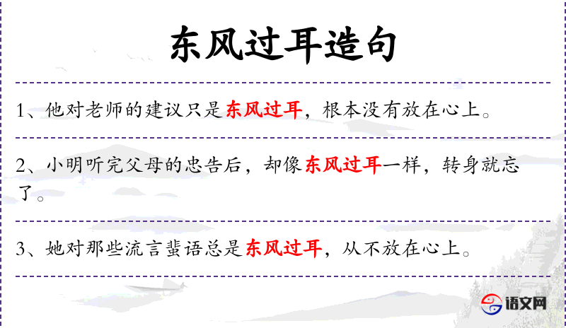 - 东风过耳:成语,比喻对别人的话不放在心上,听过就算了。
