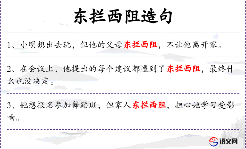 - 东拦西阻:形容多方阻挠,试图阻止。