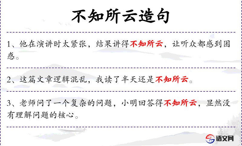 1. 【不知所云】 云:说。不知道说得是些么。形容说话内容混乱,无法理解。