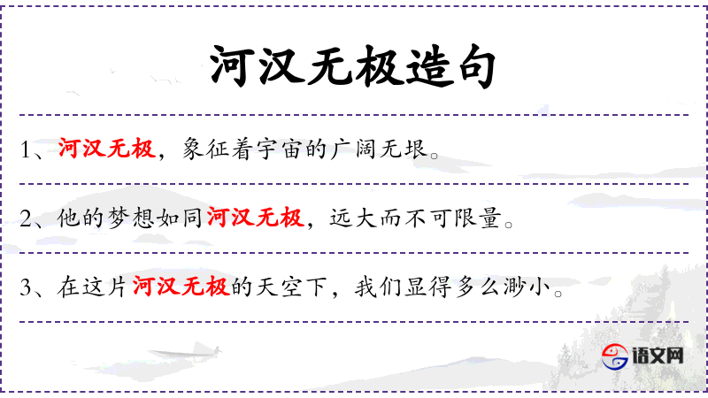 2. 【河汉无极】 河汉:银河;极:尽头,边际。银河广阔,无边无际。比喻言论荒诞不经,难以置信。亦比喻恩泽广大,使人难以报答。