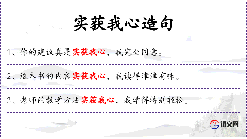 - 宾语:第一个分句中没有明显的宾语,因为“实获我心”是一个成语,直接表达了主语对内容的感受。第二个分句中也没有明确的宾语,因为“读得津津有味”描述的是一种状态而非具体的动作对象。